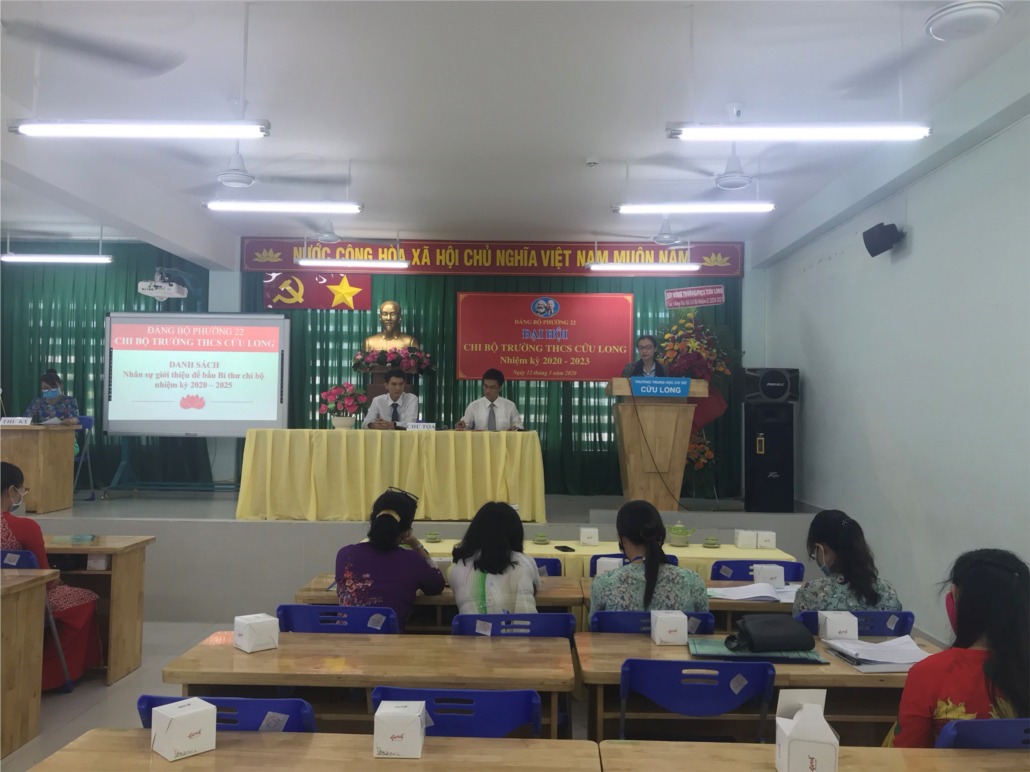 Sáng ngày 12/3/2020 vừa qua, Chi bộ trường THCS Cửu Long đã tổ chức Đại hội nhiệm kỳ 2020 – 2023 thành công tốt đẹp. Đại hội đã thảo luận, biểu quyết và thông qua những báo cáo chính trị của chi bộ nhiệm kì 2017 – 2020 trình Đại hội. Đại hội đã bầu Bí thư nhiệm kỳ 2020 – 2023 và bầu Đoàn đại biểu đi dự Đại hội đại biểu phường 22 nhiệm kỳ 2020-2025